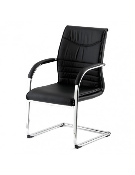 Sillón confidente de respaldo medio. Tapizado en símil piel negro o beige. Estructura interior monocasco de madera de haya contrachapada y moldeada. Apoyo de brazos tapizado. Base patín con brazos en tubo de acero oval de 40x20x2 mm., acabado cromado.