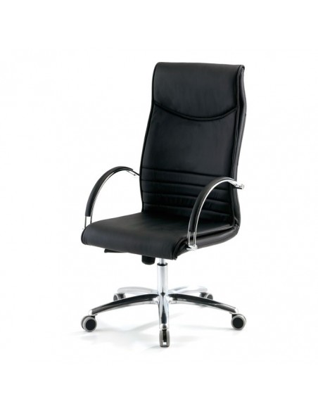 Sillón dirección de respaldo alto con basculante. Tapizado en símil piel negro o beige. Estructura interior monocasco de madera de haya contrachapada y moldeada. Brazos de acero cromado con apoyo tapizado Mayu. Espuma de alta densidad. Columna neumática de regulación de altura acabado en cromo. Base giratoria de aluminio pulido. Juego de 5 ruedas de rodadura blanda de Ø 65 mm.