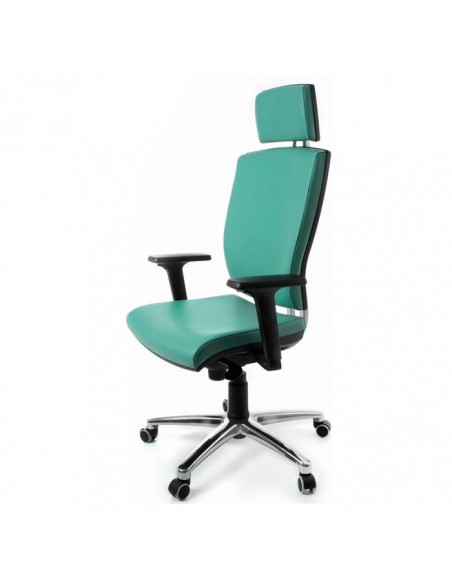 Sillón dirección de respaldo alto con cabecero. Mecanismo sincrón multi-posición. Movimiento de asiento y respaldo sincronizado. Sistema anti-retorno y regulación de tensión del respaldo, con apoyo lumbar regulable. Brazos regulables en altura y profundidad. Acolchado en asiento y respaldo en poliuretano inyectado de alta densidad, 50kg/m3. Regulación de altura mediante columna neumática. Base giratoria de aluminio pulido. Ruedas de rodadura blanda auto-frenantes de Ø 50 mm.