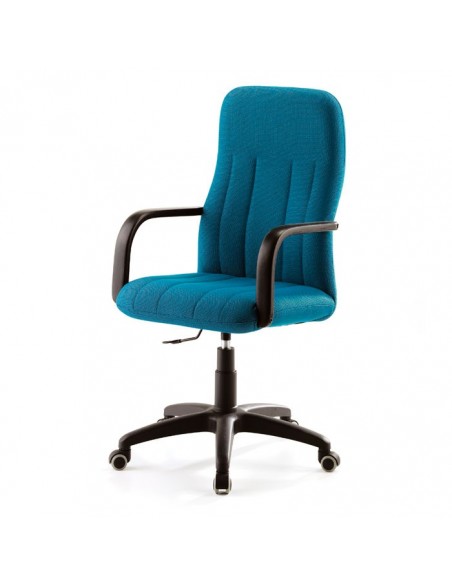 Sillón dirección de respaldo alto. Brazos de poliuretano inyectado negro Colmenar. Acolchado en poliuretano de alta densidad en asiento 30 kg/m3 y respaldo 25 kg/m3. Estructura interior de tubo redondo de acero de 20x1,5 mm. Regulación de altura mediante columna neumática. Base giratoria en poliamida negra de cinco radios reforzados con fibra de vidrio. Ruedas de rodadura blanda auto-frenantes de Ø 50 mm.