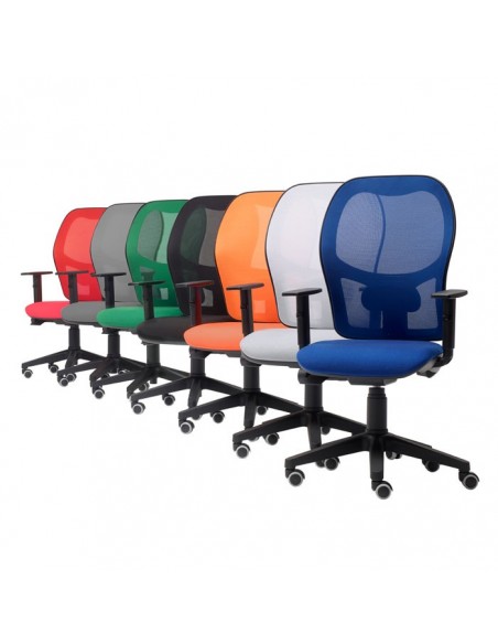 Silla giratoria de respaldo anatómico alto de malla. Mecanismo sincrón multi-posición con movimiento de asiento y respaldo sincronizado. Respaldo con apoyo lumbar regulable, sistema anti-retorno y regulación de presión. Acolchado en poliuretano de alta densidad en asiento 30 kg/m3. Brazos regulables en altura negros Fritz. Regulación de altura mediante columna neumática. Base giratoria en poliamida negra de cinco radios reforzados con fibra de vidrio. Ruedas de rodadura blanda auto-frenantes de Ø 50 mm.