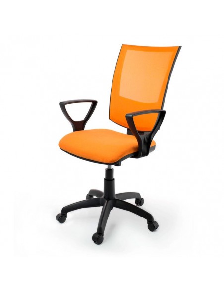 Silla giratoria respaldo anatómico medio de malla. Mecanismo contacto permanente. Respaldo regulable en altura por cremallera y en profundidad. Acolchado en poliuretano de alta densidad en asiento 30 kg/m3. Brazos fijos poliamida negros Golf. Regulación de altura mediante columna neumática. Base giratoria en poliamida negra de cinco radios reforzados con fibra de vidrio. Ruedas de rodadura blanda auto-frenantes de Ø 50 mm.