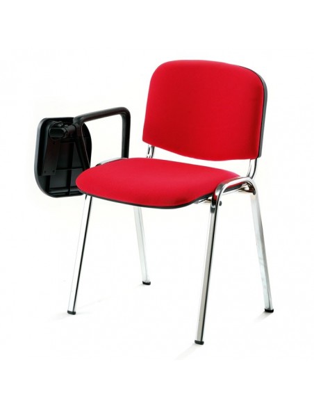 Silla fija apilable. Brazo con pala para escritura, en termoplástico negro con mecanismo abatible. Asiento y respaldo anatómicos. Acolchado en poliuretano de alta densidad en asiento 30 kg/m3 y respaldo 25 kg/m3. Carcasa exterior en asiento y respaldo de PVC negro. Estructura 4 patas en tubo de acero oval 30x15x1,5 mm. Acabado de estructura cromado. Apilable, máximo 6 unidades.