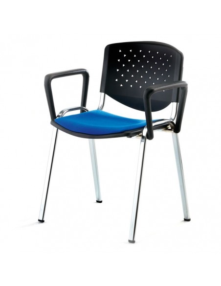 Silla fija apilable con pareja de brazos en poliuretano negro. Asiento y respaldo anatómicos. Asiento con panel tapizado y respaldo perforado de PVC negro. Panel asiento acolchado en poliuretano de alta densidad, 20 kg/m3. Estructura 4 patas en tubo de acero oval 30x15x1,5 mm. Acabado de estructura cromado. Apilable máximo 8 unidades.
